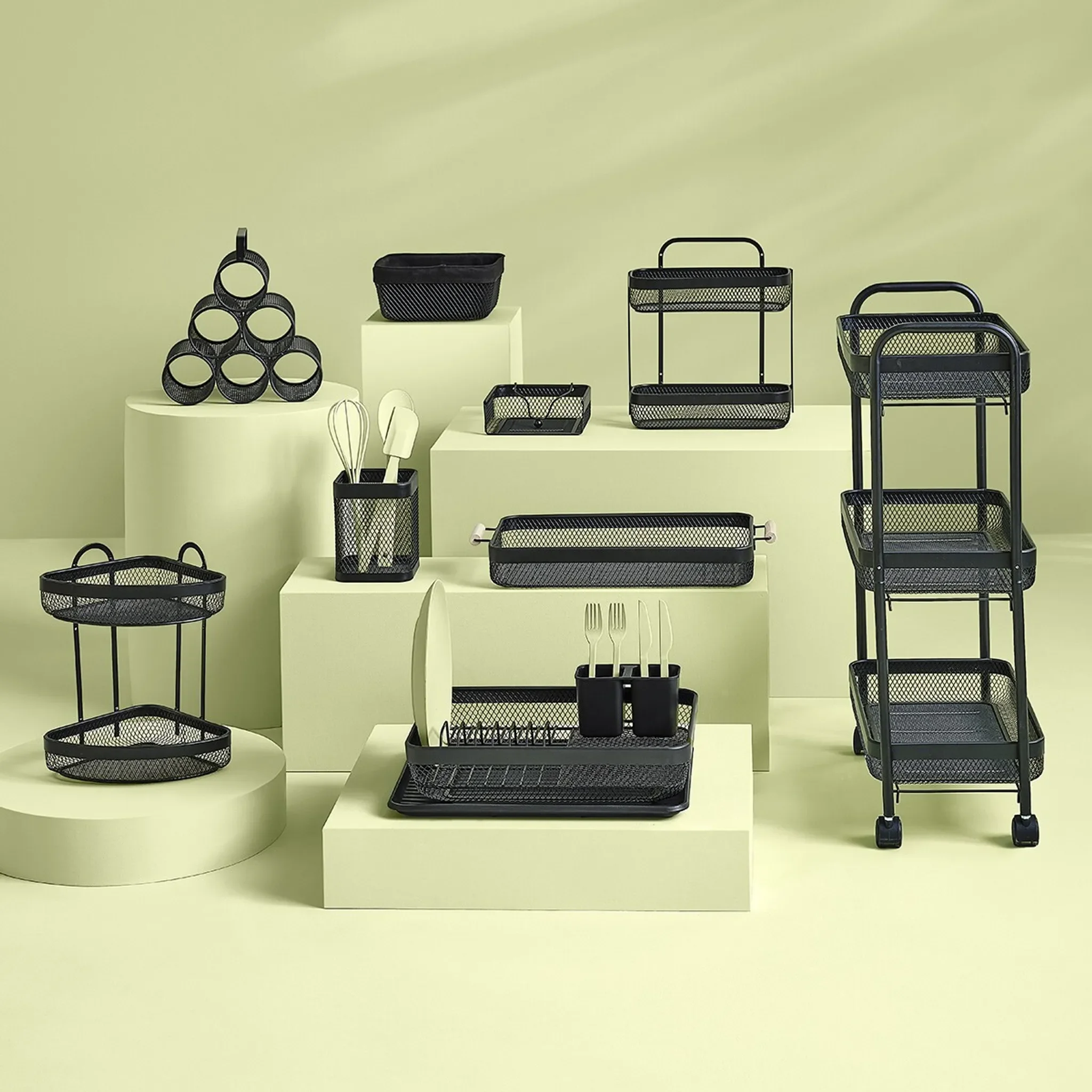 Das zweistufige Regal „Mayaj“ von 5five Simply Smart vereint modernes Design mit praktischer Funktionalität. Gefertigt aus robustem, pulverbeschichtetem Metall in elegantem Schwarz, bietet es auf zwei Gitterebenen Platz für Gewürze, Küchenutensilien, Pflegeprodukte oder Dekoration.