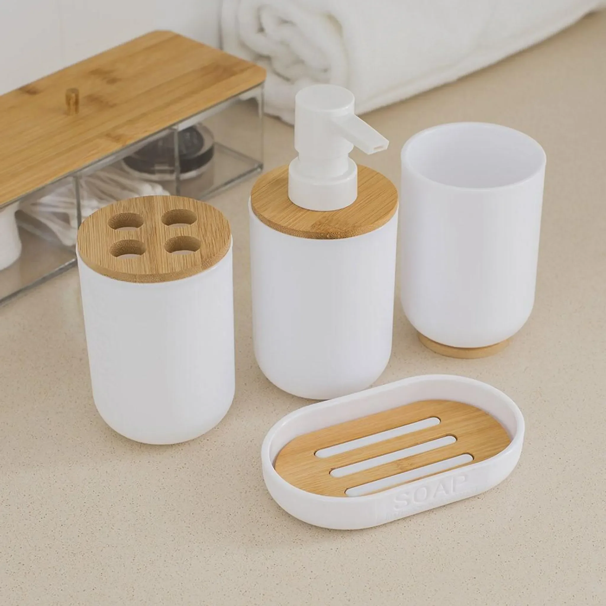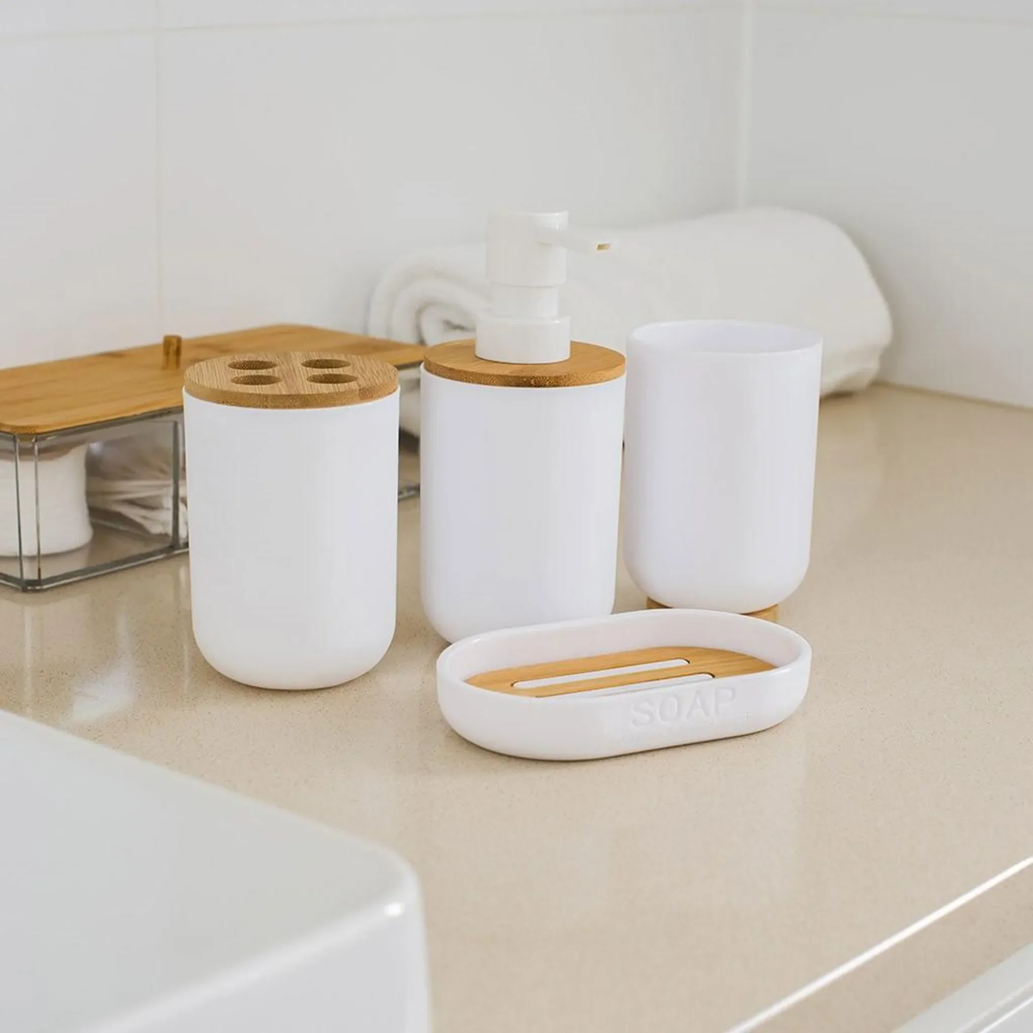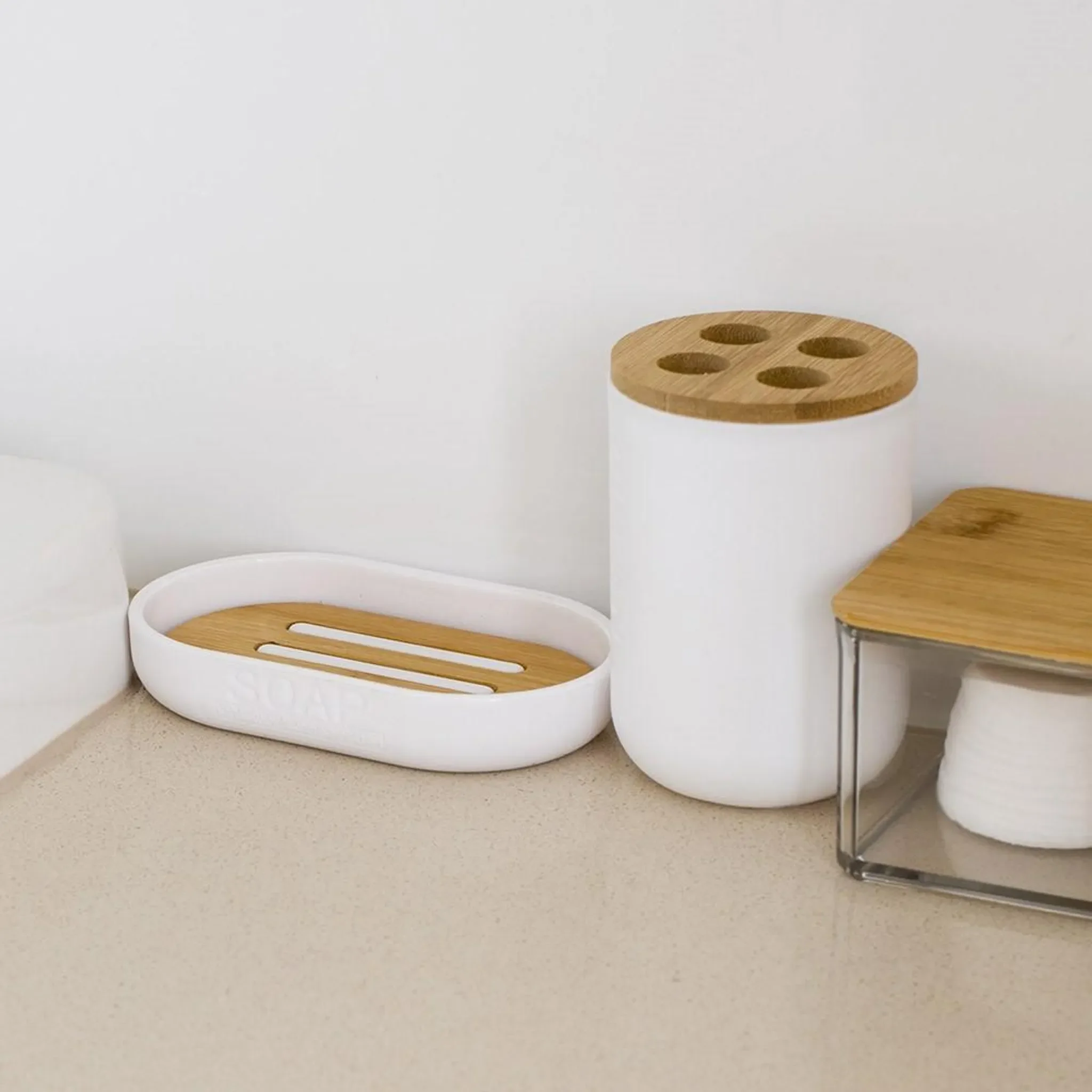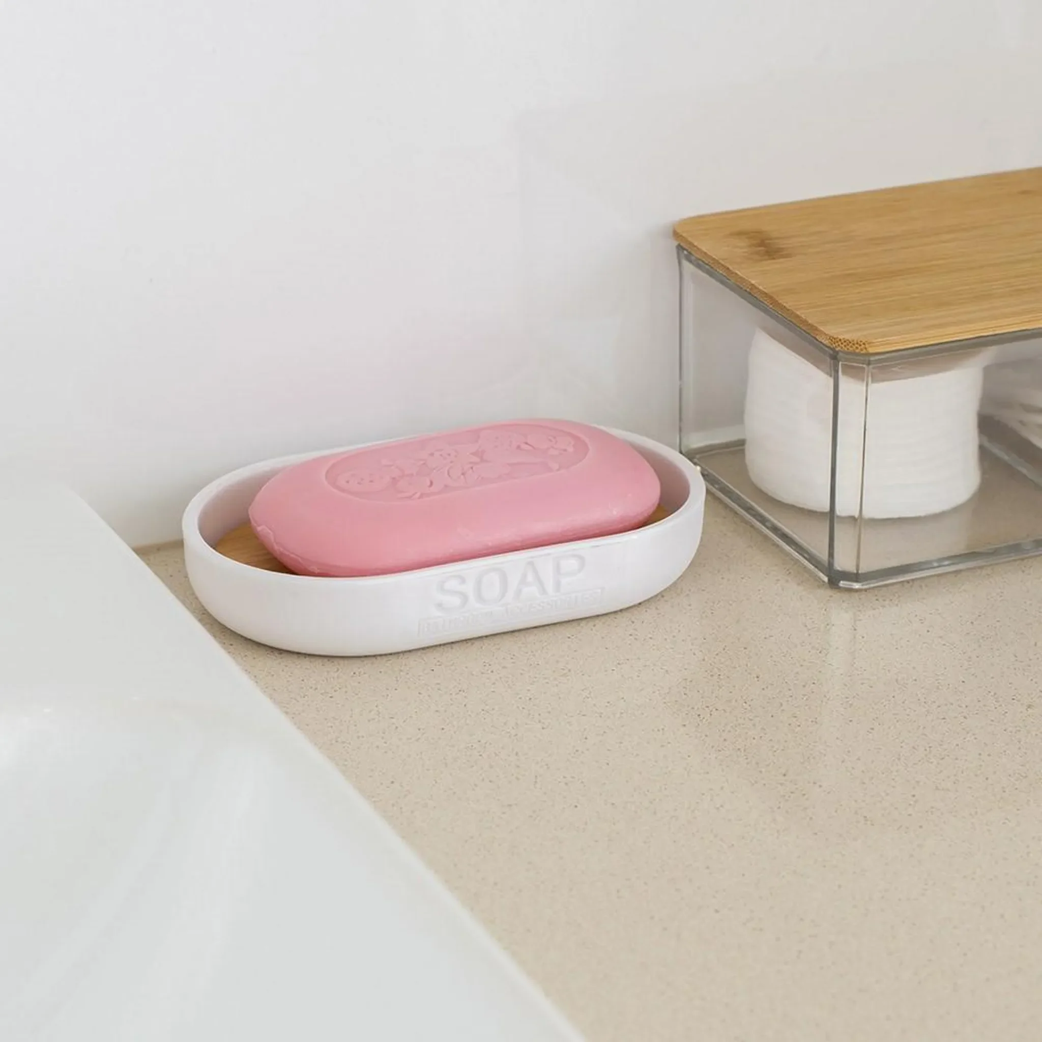 Die Seifenschale von BATHROOM SOLUTIONS kombiniert Funktionalität mit modernem Design. Sie besteht aus pflegeleichtem Kunststoff in elegantem Weiß und verfügt über eine natürliche Bambus-Abtropffläche, die Wasser von der Seife fernhält – für längere Haltbarkeit des Seifenstücks.