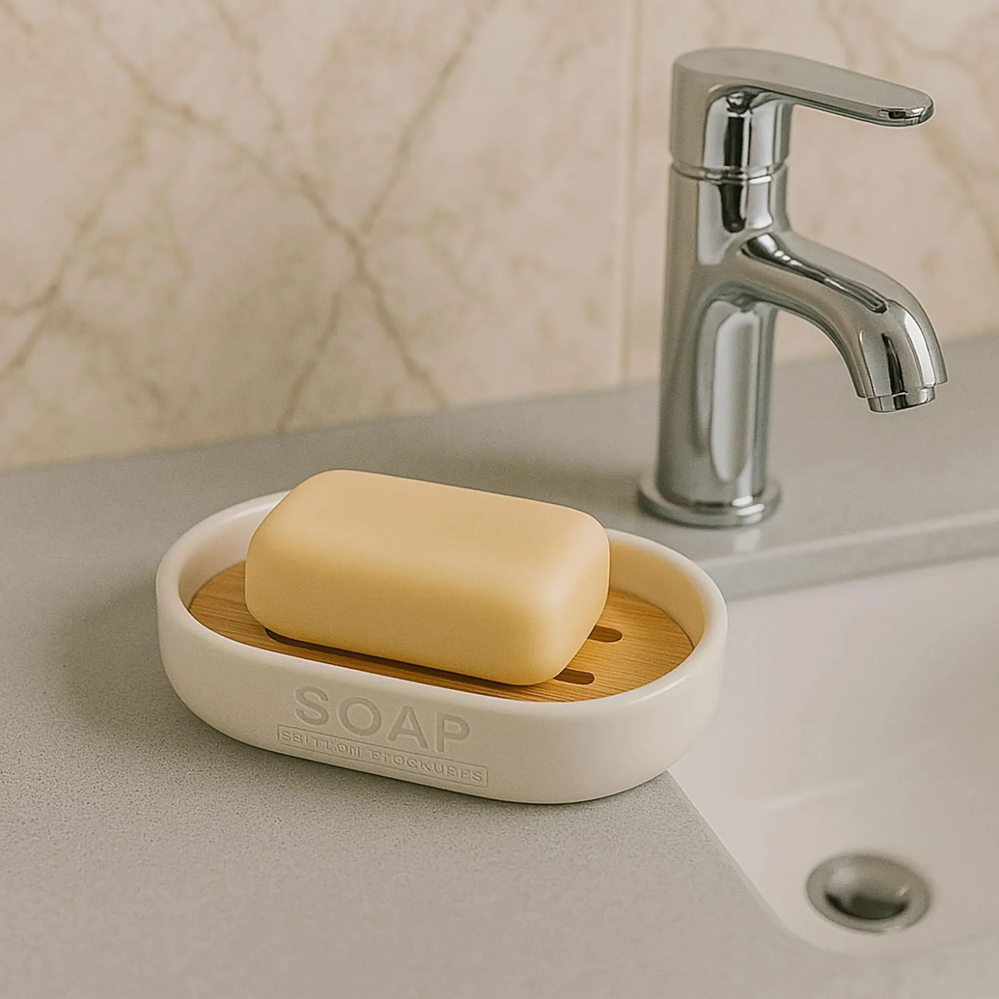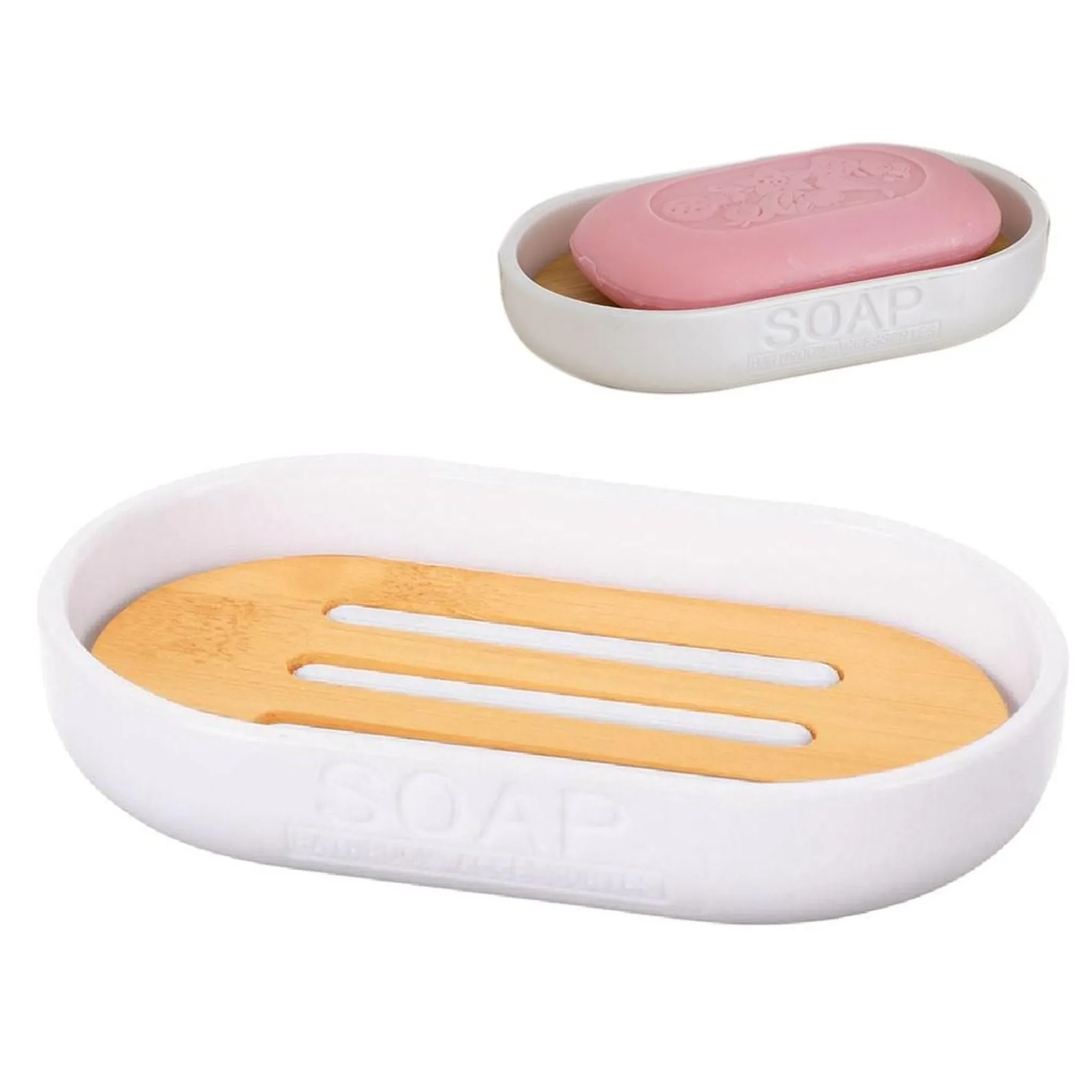 BATHROOM SOLUTIONS Seifenschale – Weiß mit Bambuseinsatz, modern & feuchtigkeitsresistent