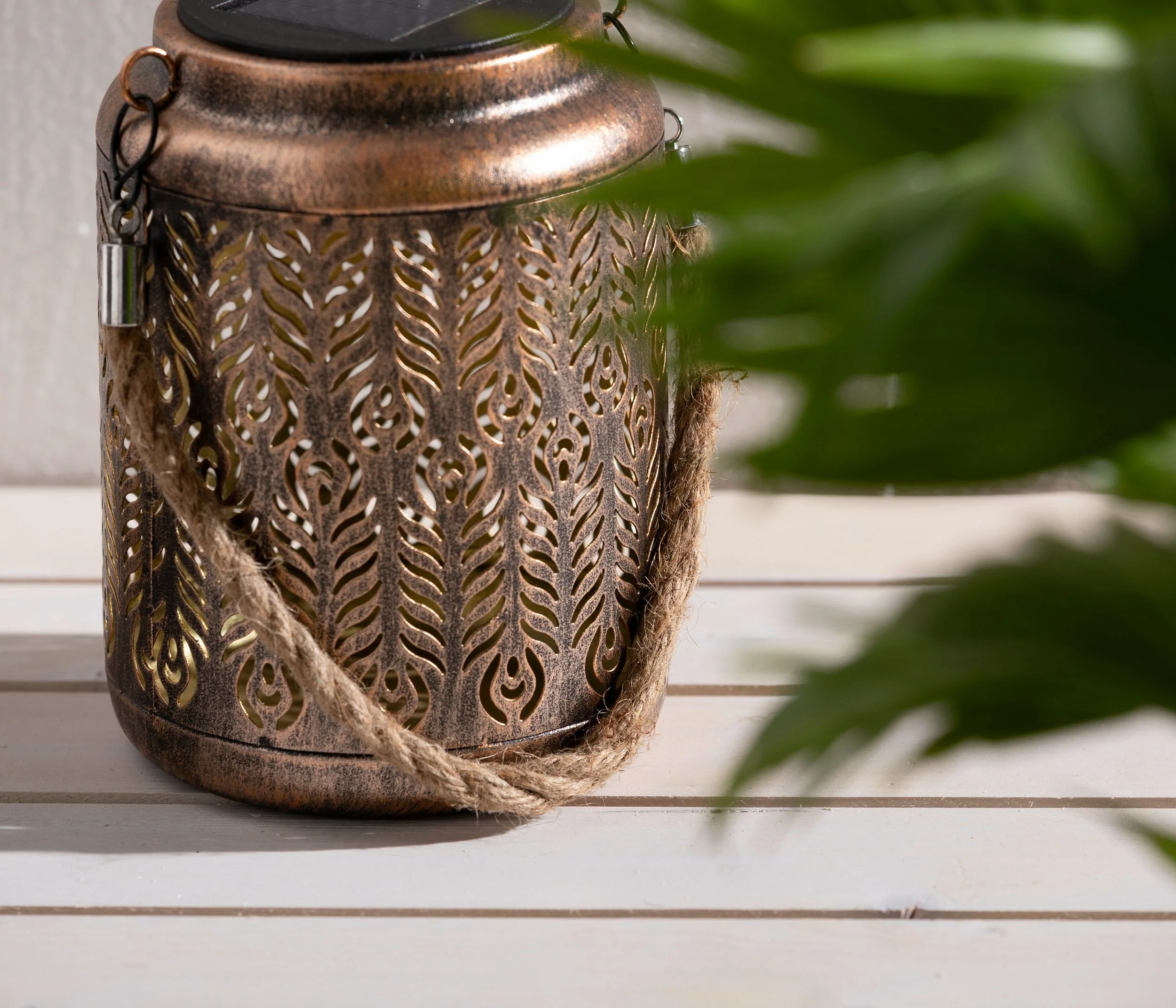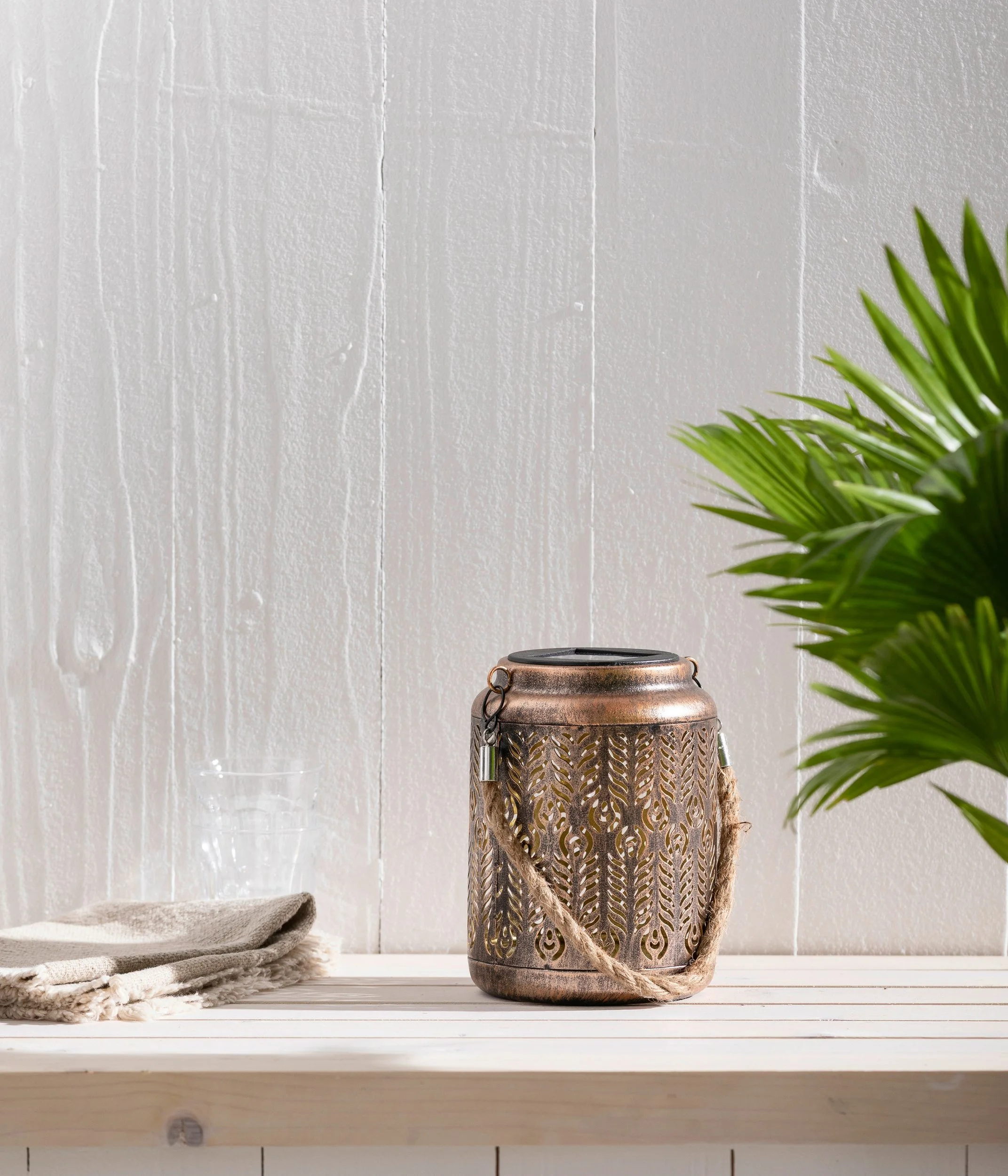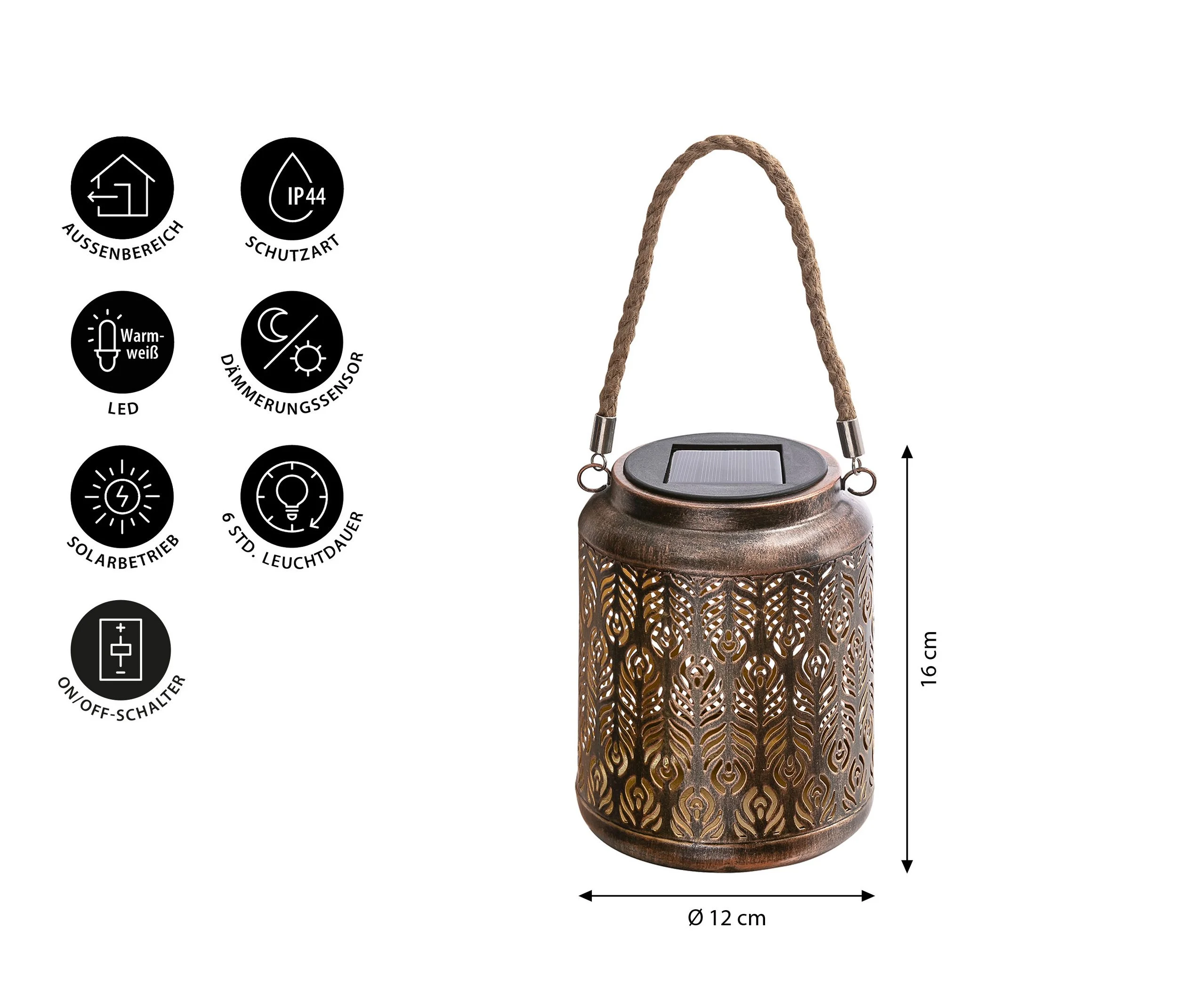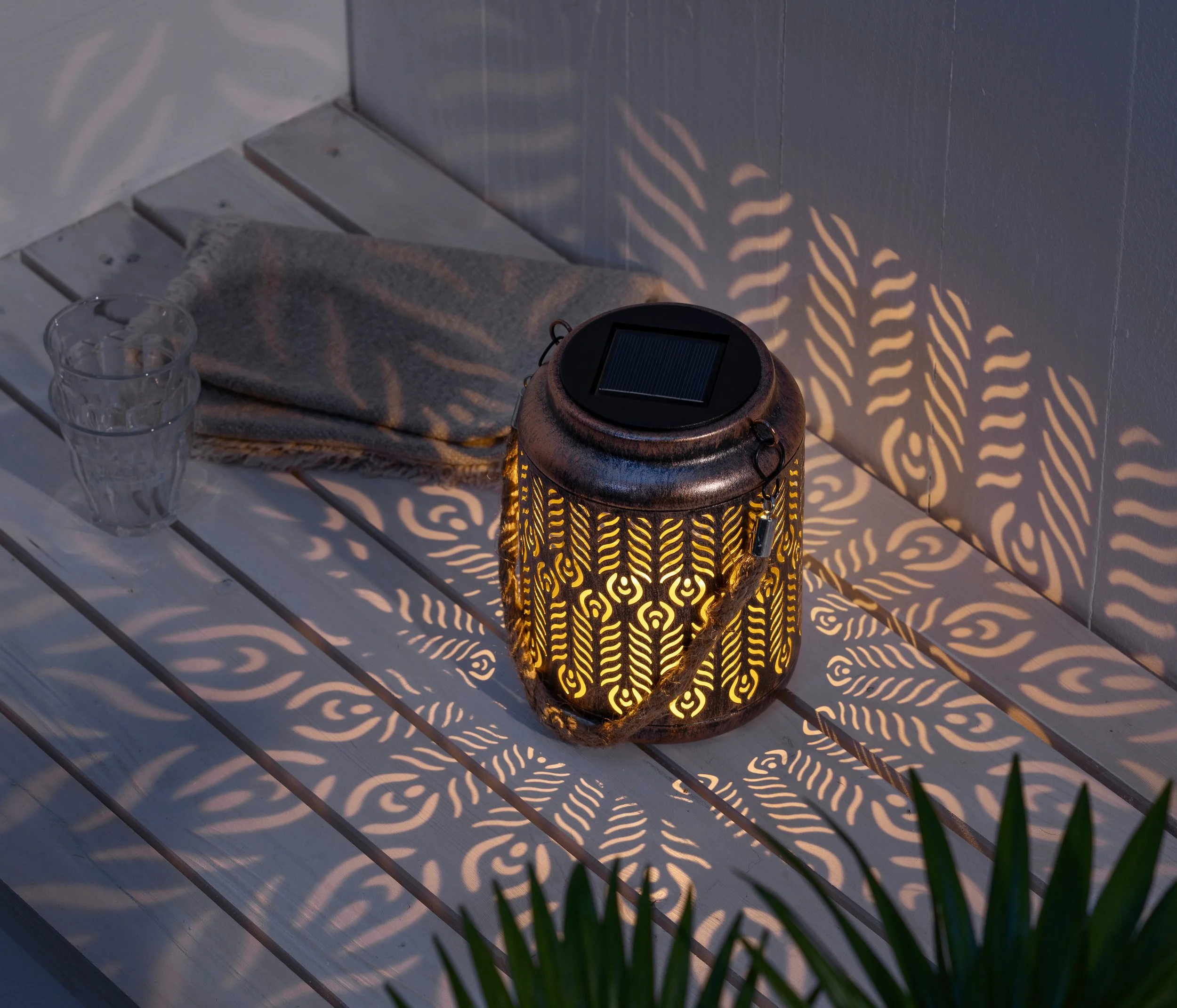 Das filigrane Muster der Laterne wirft zauberhafte Licht- und Schattenspiele an Wände und Boden, die Ihrem Outdoorbereich eine warme, behagliche Stimmung verleihen. Dank des integrierten Dämmerungssensors schaltet sich das Licht automatisch ein, sobald die Sonne untergeht, und leuchtet bis zu 6 Stunden bei vollständiger Aufladung – ganz ohne Stromanschluss.