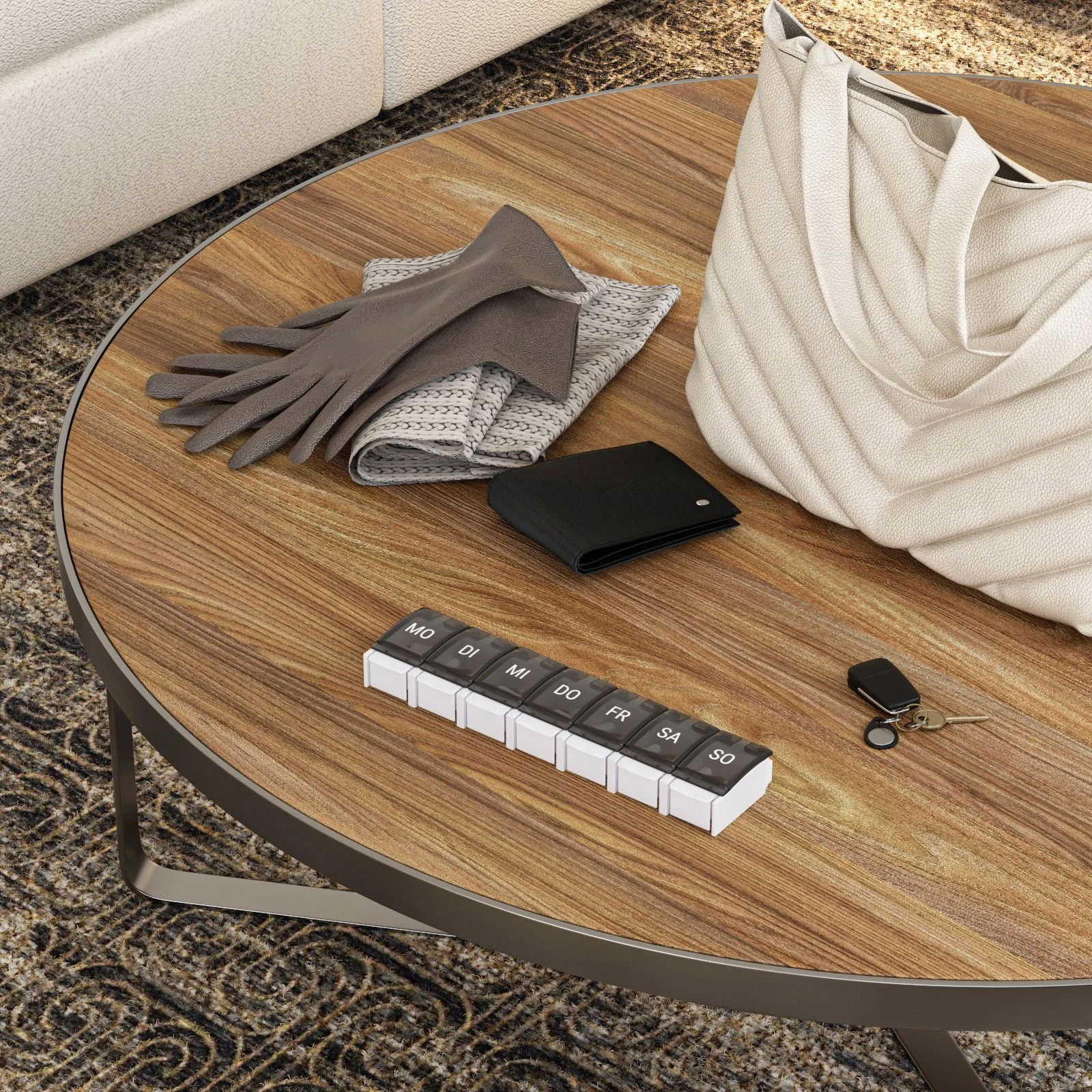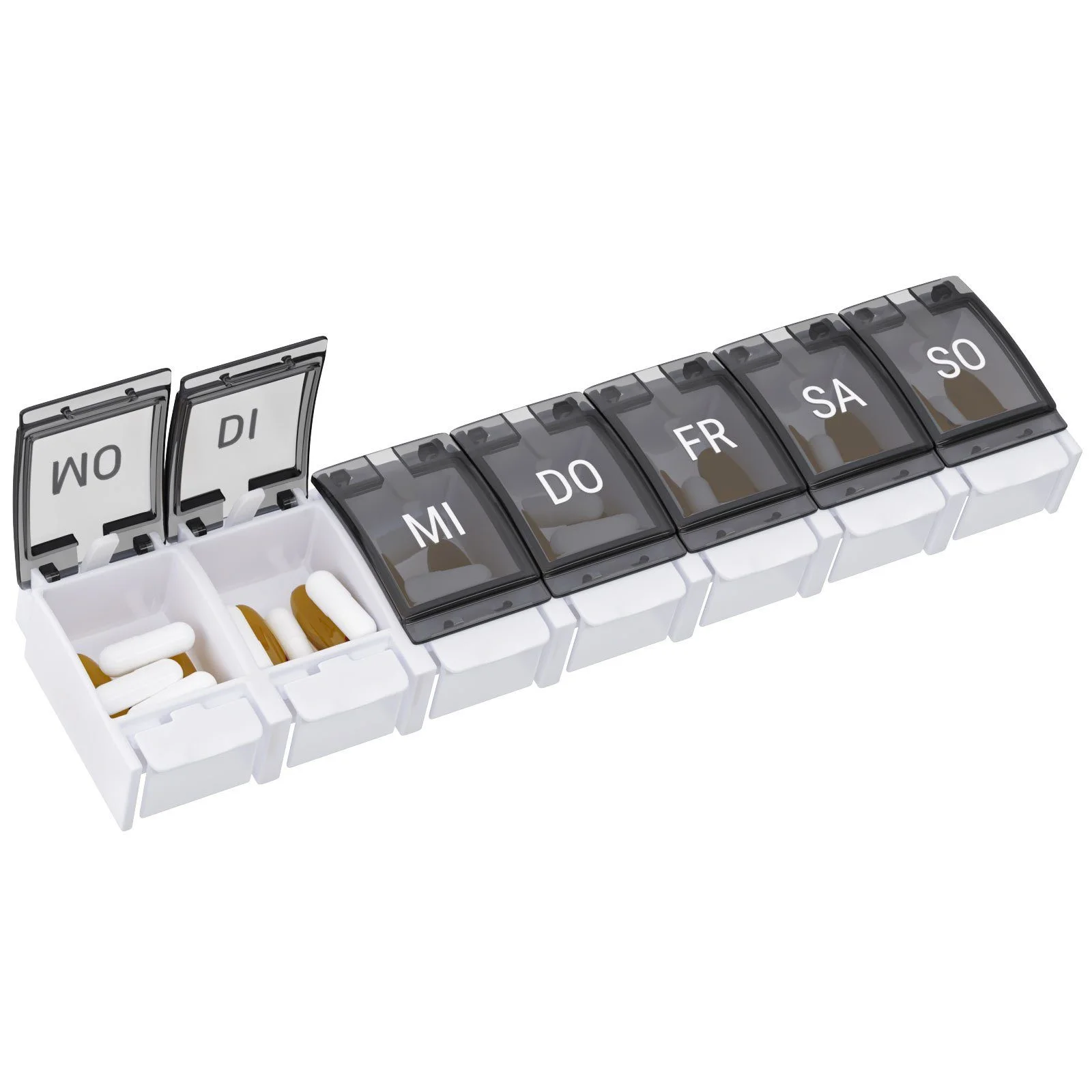 - Kapazität: 7 Tagesfächer – beschriftet mit den Wochentagen